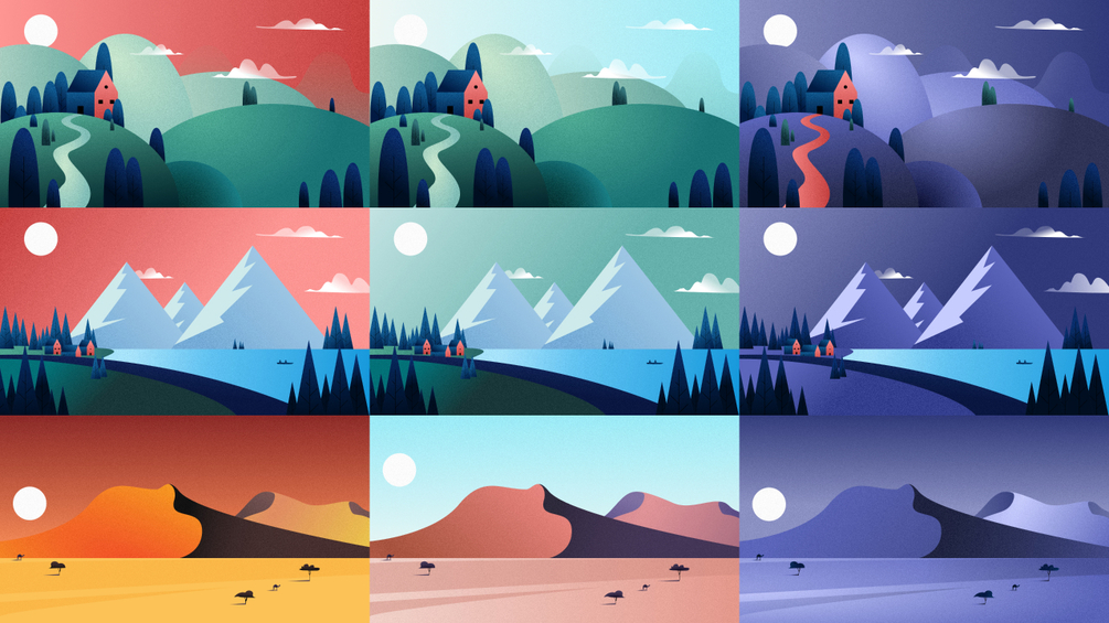 Heven't touched grass in a while? No worries, these beautifullu illustrated landscape wallpapers compensate for that. 9 Desktop and 9 Mobile Landscape themed wallpapers from the "Beautiful Landscapes" pack. These are made with Desktop and Mobile devices in mind.